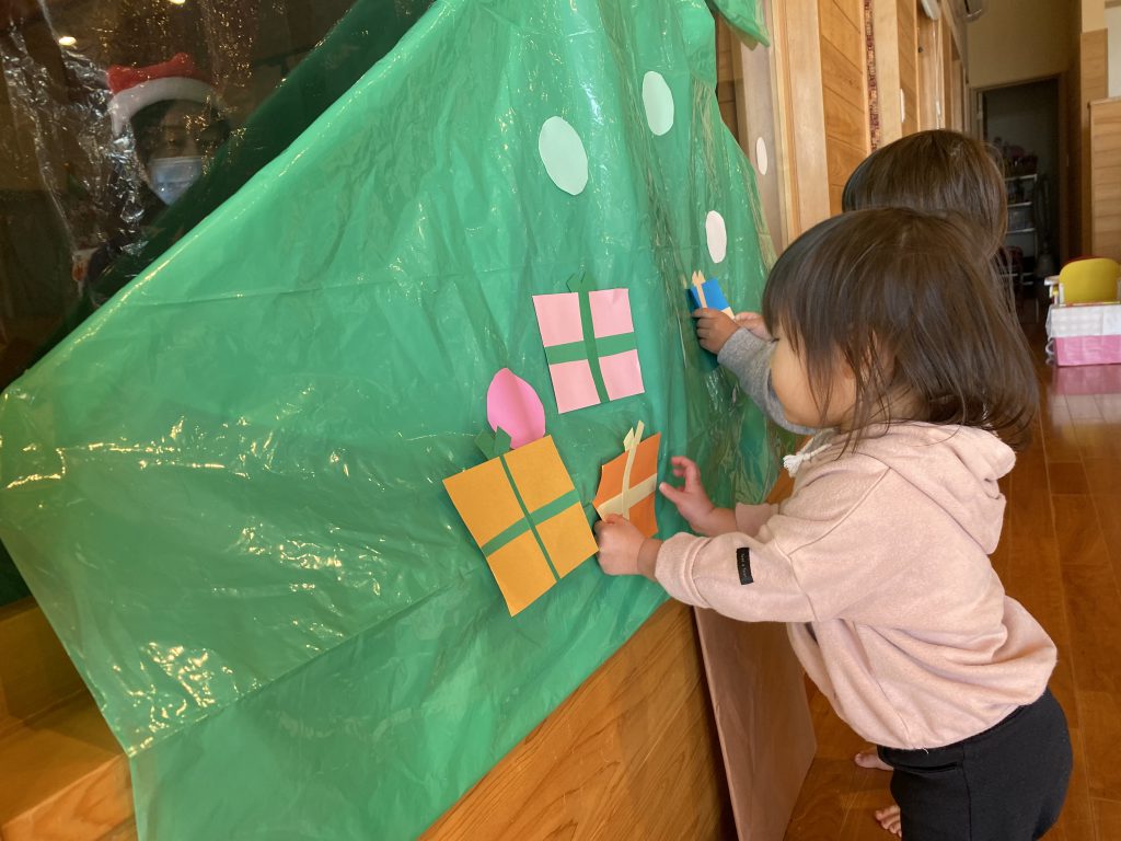 サンタさんになりきった子供たちが、プレセントを運びモミの木に飾り付け✋”みんな上手に飾り付け出来ていますね(*´▽`*)