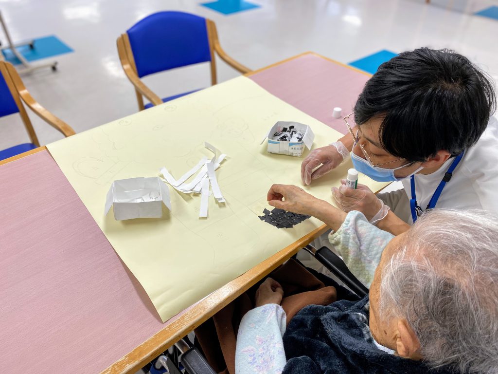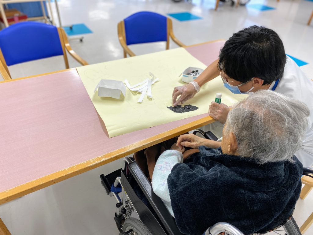 折り紙ペタペタ、壁画作り~気の早いサ〇タさん~